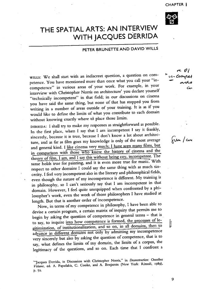 Peter Brunette & David Wills interview Derrida in 1990 in America. He talks about great work as consisting of its ability to resist “philosophical authority” and its emancipation from the hegemony and authority of philosophical discourse. In other words that which makes the work unplaceable, enabling it to escape the space of certainty.The idea being that if the work is only there to fill a hole – that is, it meets historical, ideological and technical requirements- then there is no work (of art presumably). If there is work, it is because that even when all conditions of analysis have been met, something else still happens. If the same thing is being recognized then it would be a stillborn, dead from the start, and nothing has happened. It needs to transform, to move elsewhere for something to have happened. Download the full interview.